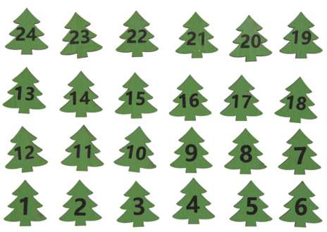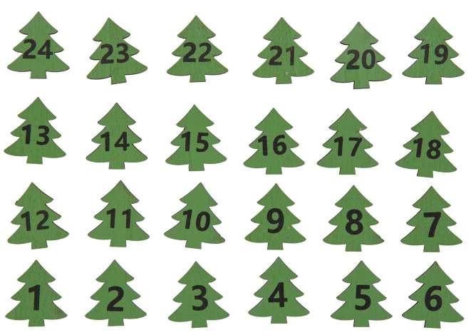 Adventskalender-Zahlen "Bäume" aus Holz, Zahlen von 1–24 mit Klebepunkt auf der Rückseite, Farbe: grün, Größe: 2,5 x 2,5 cm, Inhalt: 24 Stück.