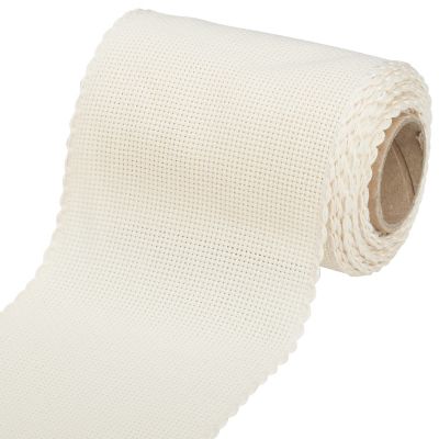 Aida-Stickband mit gewelltem Rand, zum individuellen Besticken, Dekorieren und Basteln geeignet. Stofffarbe: natur, Breite: 10 cm, Stickbreite: 9 cm, 5 m pro Rolle. Material: 100 % Baumwolle (ca. 6 Stiche/cm).