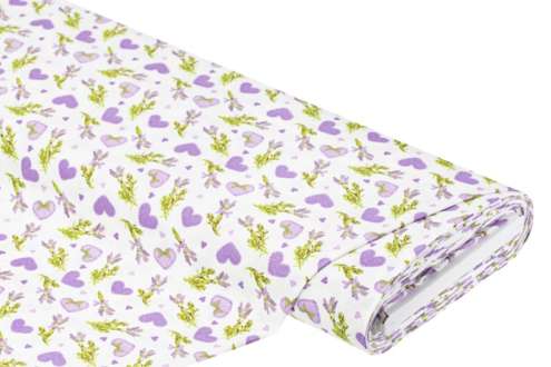 Exklusiv von buttinette: Baumwollstoff "Lavendel/Herzen", Farbe: weiß-color, aus der Quiltserie "Mona", aus besonders feiner, weicher und hochveredelter Baumwolle (Renforcé), Motivgröße Herz: 2,5 x 2 cm, Breite: 150 cm, Gewicht: ca. 130 g/m². Material: 100 % Baumwolle.
