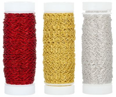 Bouillon-Effektdraht-Set, Inhalt: je eine Rolle in rot, silber und gold, Stärke: 0,25 mm, 50 m pro Rolle.