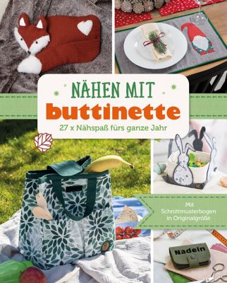 "Nähen mit buttinette – 27 x Nähspaß fürs ganze Jahr". Buch mit 27 zauberhaften Projekten für jede Jahreszeit. Ob ein romantischer Blumenkranz oder niedliches Osterkörbchen, Praktisches wie die isolierte Lunchbag, die Trinkgläser-Hauben, Kürbis-Topflappen oder die Fuchs-Wärmflasche – viele tolle Projekte warten darauf nachgenäht zu werden! Auch für die Weihnachtszeit gibt es wieder viele liebevolle Nähideen, vom Pinguin-Adventskalender bis zum Deko-Schlitten, der sogar als Geschenkkorb verwendet werden kann. Detaillierte Anleitungen mit vielen Bildern, Schnittmusterbogen in Originalgröße und ein Grundkurs machen das Nacharbeiten einfach. Buch mit 84 Seiten. Größe: 21 x 26 cm.