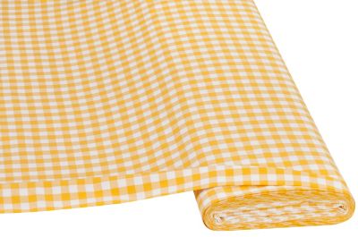 Buntgewebtes Vichykaro in fester Qualität, Farbe: gelb/weiß, Karogröße: 1 x 1 cm, Breite: 150 cm, Gewicht: ca. 145 g/m². Einlaufwert: ca. 8 % in der Länge. Material: 100 % Baumwolle.