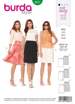 burda Schnitt "Rock mit Gummizug", Anleitung für 3 Modelle: mit einseitiger Falte, leicht schwingend oder schlicht in gerader Linie ist für alle Anlässe das passende Outfit schnell und einfach genäht, mit bequemem Gummizug, Größe 32 - 54 (Doppelgrößen), Schwierigkeitsstufe: sehr leicht, Stoffempfehlung: Viskose-, Baumwollstoffe.