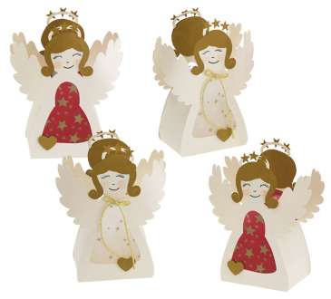 Bastel-Set Tischlaternen "Engel", exklusiv von buttinette, zum Basteln von 4 Tischlaternen in der Größe 9,5 x 12 cm. Inhalt: 4 Blatt Perlmuttkarton DIN A4, 250 g/m², 1 Blatt Fotokarton DIN A4, 300 g/m², 2 Blatt Transparentpapier, DIN A4, 115 g/m², Vorlagebogen und eine Anleitung.