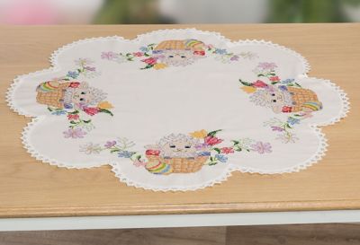 buttinette Form-Mitteldecke "Little Sheep", zum Besticken in Kreuzstich. Vorgedrucktes Motiv, Stoff in Blumenform, eingefasst mit elfenbeinfarbenem Spitzenband. Komplettpackung: Anleitung, Garn, Sticknadel. Stofffarbe: elfenbein. Größe: Ø 75 cm. Material: Stoff und Garn 100 % Baumwolle.