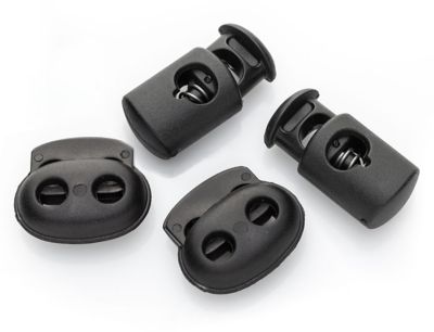 buttinette Kordelstopper-Set, Farbe: schwarz, Inhalt: zwei 1-Loch-Stopper für max. Kordelstärke 6 mm Ø, zwei 2-Loch-Stopper für max. Kordelstärke 5 mm Ø. Material: Kunststoff.