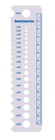 Strickende und Häkelnde haben manchmal das Problem, dass auf Ihren Strick- und Häkelnadeln die Beschriftung der Größe abgerieben und daher nicht mehr zu erkennen ist. Mit diesem Nadelmaß von buttinette gehört dieses Problem in Zukunft der Vergangenheit an: Einfach die Nadel in die Messaussparung legen und den entsprechenden Wert ablesen – schnell und unkompliziert können Sie so die Stärke der Nadeln ermitteln. Praktisch: Das Nadelmaß hat an der Seite ein Lineal aufgedruckt und ist somit auch ideal, um Maschenproben zu vermessen.