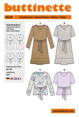 Schnitt "Stufenkleid & Bluse" für Damen, exklusiv von buttinette, Anleitung für 4 Modelle, Größe: 34–52, Schwierigkeitsstufe 3/5, Stoffempfehlung: leichte Webware ggf. mit Elasthan wie leichte Baumwolle, Viskose, Leinen oder Crêpe.
