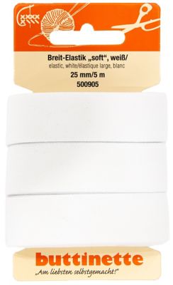 buttinette Soft-Gummiband "Breit-Elastik", besonders weich und anschmiegsam, Farbe: weiß, Breite: 25 mm, Länge: 5 m. Material: 60 % Polyamid, 20 % Polyester, 20 % Gummi.
