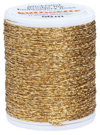 buttinette Sticktwist "Metallic", 10-fädig, Farbe: gold, 50 m pro Spule. Material: 60 % Polyester, 40 % Polyamid.