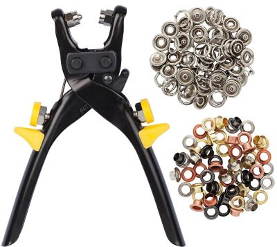 buttinette Zange aus Stahl, Länge: 16 cm, inkl. 100 Ösen aus Stahl, Farbe: gold, kupfer, schwarz, silber, Größe: 5 mm Ø (innen), und 25 Druckknöpfe aus Stahl, Farbe: silber, Größe: 9 mm Ø und eine Arbeitsanleitung.