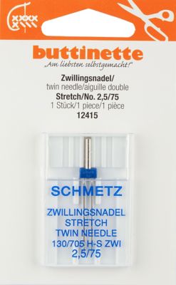 buttinette Zwillingsnadel "Stretch" (Doppelnadel), für Doppel- und Ziernähte, in Flachkolben-Ausführung. Stärke: 75, Nadelabstand: 2,5 mm, Inhalt: 1 Stück, inklusive Aufbewahrungsbox. Material: Stahl.