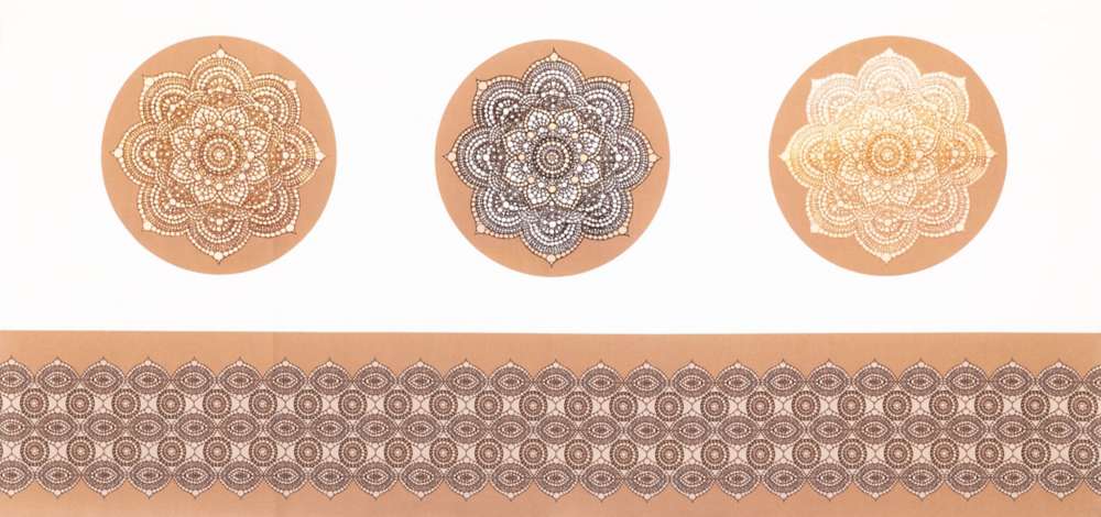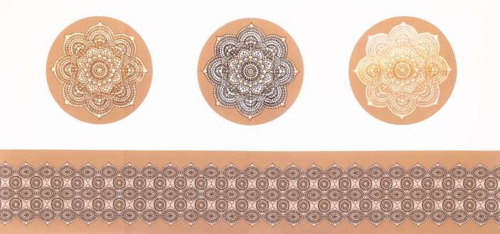 Exklusiv von buttinette: Canvas-Coupon "Mandala", Farbe: hellbraun-color, aus der Serie "Doreen", für 1 Yogakissen oder 3 Kissen 40 x 40 cm, Motivgröße Mandala: je 30 cm Ø, Seitenstreifen: 23 x 140 cm, Coupongröße: 65 x 140 cm, Gewicht: ca. 220 g/m². Material: 100 % Baumwolle.