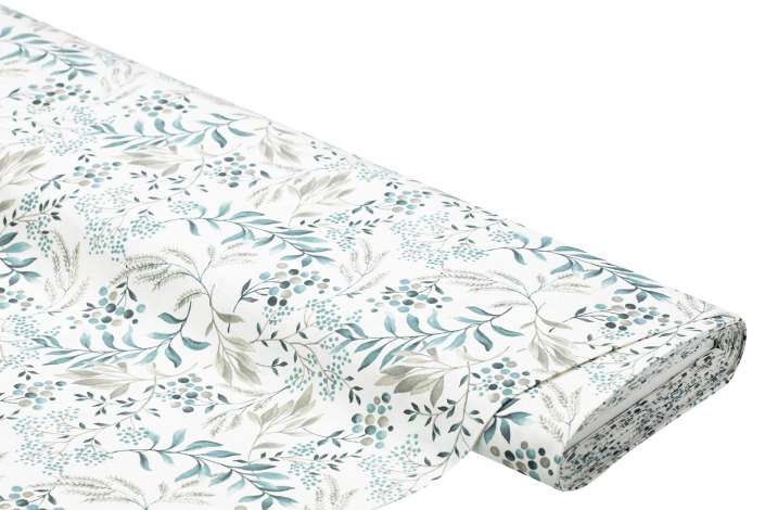 Dekostoff "Blätter & Beeren" aus der Serie Lorena, Farbe: weiß/graugrün, Motivgröße Beeren: 2–7 mm Ø, Breite: 140 cm, Gewicht: ca. 170 g/m². Material: 70 % Baumwolle, 30 % Polyester.