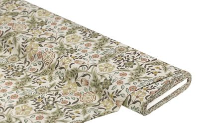 Dekostoff "Skandinavische Blumen" aus der Serie Lorena, Farbe: natur-color, Motivgröße grüne Blüte: 3,5 cm Ø, Rapport: 27,5 cm, Breite: 140 cm, Gewicht: ca. 170 g/m². Material: 50 % Baumwolle, 50 % Polyester.