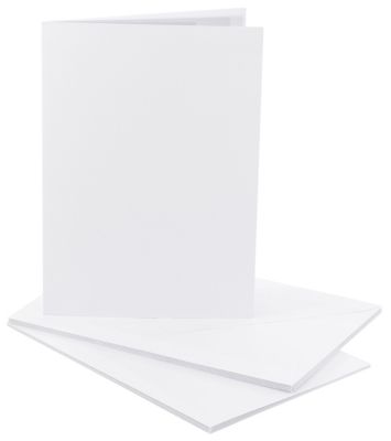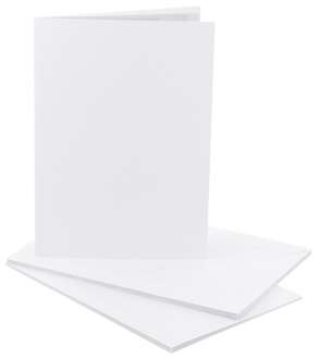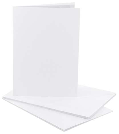 Doppelkarten mit Briefhüllen, Farbe: weiß, Kartengröße: 148 x 210 mm (DIN A5), Gewicht: 240 g/m², Briefhüllengröße: 156 x 220 mm, Gewicht: 115 g/m², Inhalt: 5 Karten und 5 Briefhüllen.