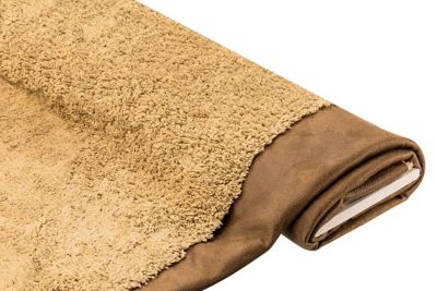 Doubleface Kunstleder mit Fellimitat, Farbe: mokkabraun/hellbraun, Vorderseite Velourslederimitat, Rückseite Fellimitat, Stärke: 1 cm, Breite: 145 cm, Gewicht: ca. 435 g/m². Material: 100 % Polyester.