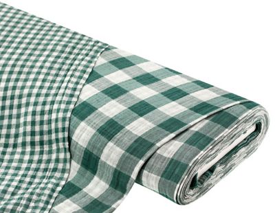Doubleface Musselin/Doppel-Gaze "Karo", Farbe: eukalyptus, Motivgröße großes Karo: 3 x 3 cm, Motivgröße kleines Karo: 0,7 x 0,7 cm, Breite: 130 cm, Gewicht: ca. 120 g/m². Material: 100 % Baumwolle.