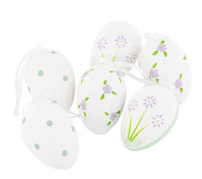 Eier "Blümchen" aus Kunststoff, Farben: weiß, flieder, grün, Größe: 6 cm, Inhalt: 6 Stück.