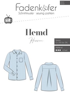 Fadenkäfer Schnitt "Hemd" für Herren, Anleitung für mehrere Varianten, Größe 2XS–5XL, Schwierigkeitsstufe: schwer, Stoffempfehlung: leichte, gewebte Stoffe, z. B. Hemdenjeans, Popeline, Flanell, Viskose, Babycord, Chambray, Leinen.