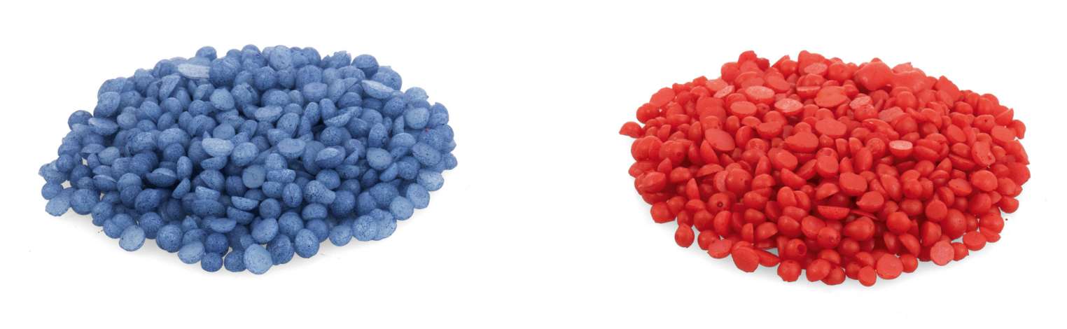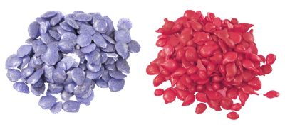 Färbepastillen, Farben: blau und rot, zum Färben von flüssigem Kerzengel und Gießwachs, Inhalt: 20 g pro Farbe = 40 g, 10 g sind ausreichend für ca. 500 g Wachs.