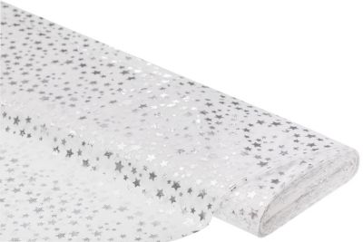 Feintüll "Sterne", Farbe: weiß-color, transparent, Motivgröße großer Stern: 1,5 cm Ø, Breite: 150 cm, Gewicht: ca. 35 g/m². Material: 100 % Polyester.