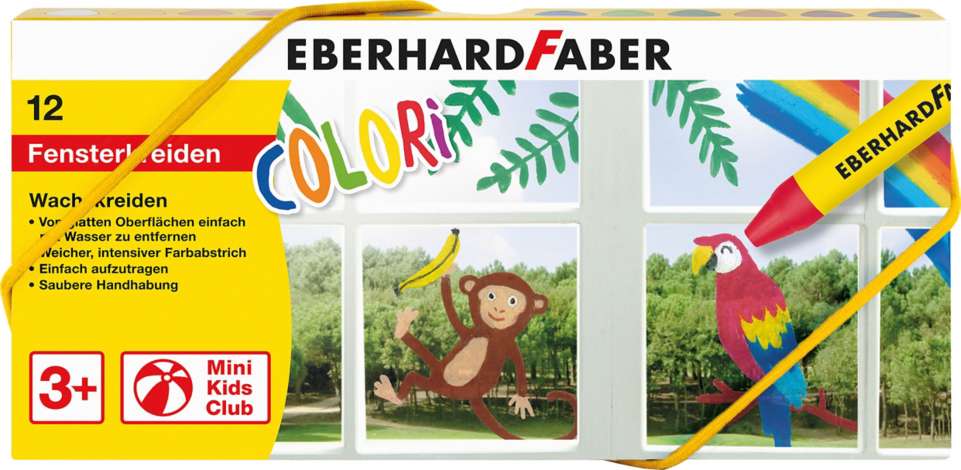 Fensterkreiden aus Wachs, Farbe: bunt, einfach aufzutragen, dreiflächig mit Papierbanderole, von glatten Oberflächen einfach mit Wasser zu entfernen, Inhalt: 12 Stück. Für Kinder ab 3 Jahren geeignet.