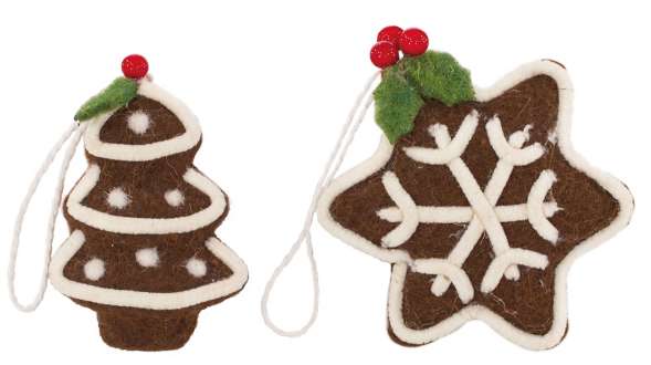 Hänger "Lebkuchen" aus Styropor, mit Filz überzogen, Farbe: braun-weiß-grün-rot, Größen: Baum: 9 x 6 cm, Stern: 9 cm Ø, Inhalt: 2 Stück.