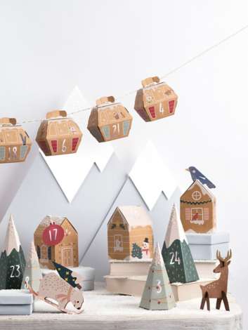 folia Adventskalender "Winterland" zum Basteln von 8 Bäumen in zwei verschiedenen Größen, 8 Häuschen und 8 Gondeln in den Größen 8 x 14,5 cm, 6,4 x 11,5 cm, 6,3 x 6,3 x 10,4 cm und 5,5 x 7,3 x 8 cm. Inhalt: 24 Boxen, bereits vorgestanzt und genutet, Adventskalenderzahlen, 40 Papierhänger, 24 Papierfiguren, 4 m Bäckergarn.