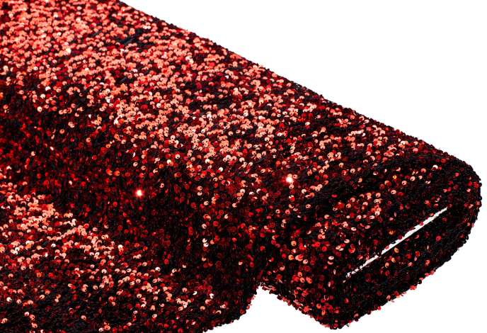 Funkelnder Paillettenstoff, Farbe: rot, querelastisch, blickdicht, Paillettengröße: 5 mm Ø, Breite: 125 cm, Gewicht: ca. 485 g/m². Material: 100 % Polyester.