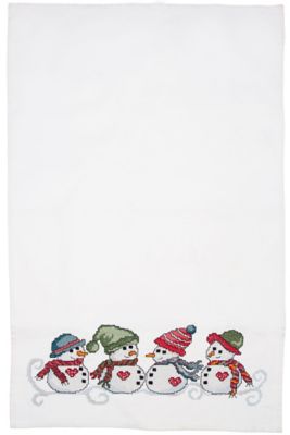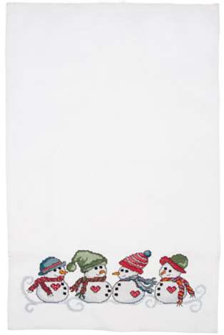 Geschirrtuch "Schneemänner", zum Besticken in Kreuz- und Knötchenstich. Fertig genäht mit vorgedrucktem Motiv. Komplettpackung: Anleitung, Garn, Sticknadel. Stofffarbe: weiß. Größe: 46 x 71 cm. Material: Stoff und Garn 100 % Baumwolle.
