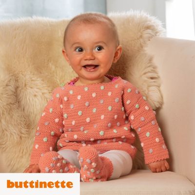 Häkelanleitung – Babypullover aus Woll Butt Baby. Happy Confetti: Wie man sieht, macht dieser Pulli im Handumdrehen gute Laune! Er besteht aus festen Maschen, wobei die bunten Pünktchen gleich mit eingehäkelt werden. An die Kanten werden Mäusezähnchen angehäkelt. Dazu gibt’s passende Söckchen im gleichen Design.