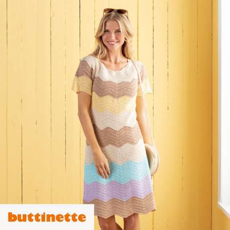 Häkelanleitung – Kleid aus Woll Butt Sonja. Einfach überstreifen und ab an die Sonne – mit diesem Häkelkleid aus der Qualität Woll Butt Sonja machen Sie an warmen Tagen eine gute Figur! Mit seinem runden Ausschnitt und den kurzen Ärmeln ist das Kleid zeitlos schön und wird Sie bestimmt mehrere Sommer lang begleiten. Die pastellfarbenen Blockstreifen im Wellenmuster werden komplett in Runden gehäkelt.