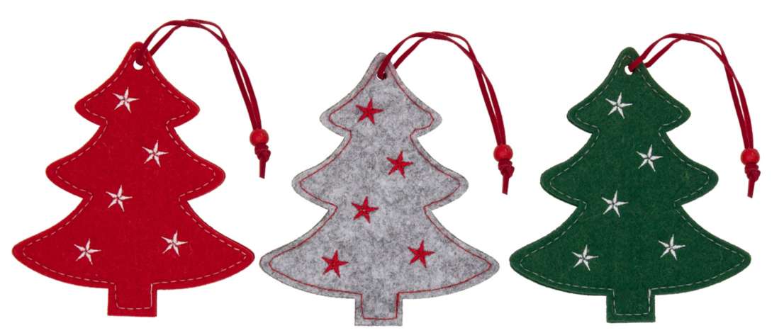 Hänger "Tannenbaum" aus Filz, mit aufgestickten Schneeflocken, Farben: rot, grau, grün, Größe: 10,5 x 12 cm, Inhalt: 3 Stück. Material: 100 % Polyester.