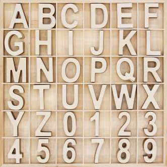 Buchstaben und Zahlen aus Holz, von A-Z und 0–9, mit praktischer Sortierbox (34 x 34 x 2 cm), Farbe: natur, Höhe: 5 cm, Stärke: 2 mm, Inhalt: je Zeichen 6 Stück = 216 Stück.