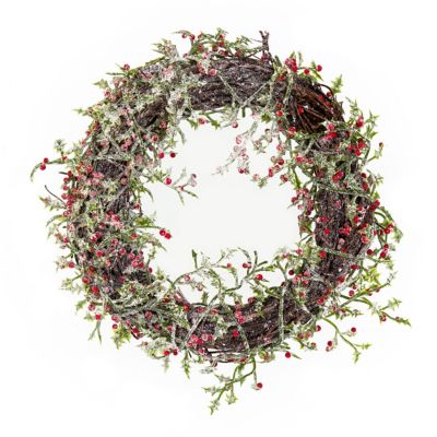 Ilexrebenkranz mit Glitter und vereister Optik, Farbe: braun, mit grüner Ilexgirlande und roten Beeren, Größe: 15 cm Ø, Stärke: ca. 3,5 cm. Material: Rebe und Kunststoff.