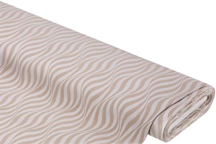 Jacquard "Wellen", Farbe: taupe, Rapport: 12 cm, Breite: 160 cm, Gewicht: ca. 230 g/m². Einlaufwerte: 2–3 % in Länge und Breite. Material: 60 % Polyester, 40 % Baumwolle.