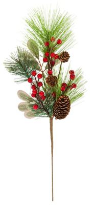 Kiefernzweig aus Kunststoff, mit braunen Zapfen und roten Beeren, Farbe: grün, Länge: 49 cm, Stiellänge: 19 cm.