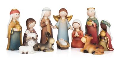Kindliche Krippenfiguren aus Polyresin, Größe: 2,5–11 cm, Inhalt: Maria, Josef, Jesuskind in der Krippe, Heilige Drei Könige, Engel, Ochse, Esel, Hirte mit Schaf, Schaf.