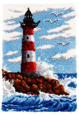 Knüpfteppich "Leuchtturm". Komplettpackung: Anleitung, Garn, Knüpfhaken. Größe: 50 x 74,5 cm. Material: bedruckter Stramin 50 % Baumwolle, 50 % Polyester (ca. 18 Stiche/10 cm), Garnschnittpackungen 100 % Polyacryl.