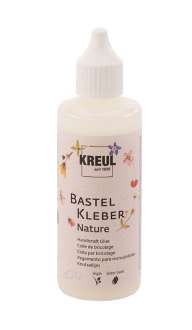 Kreul Bastelkleber "Nature", auf Wasserbasis, lösemittelfrei, vegan, enthält mind. 80 % Rohstoffe natürlichen Ursprungs, trocknet transparent. Für saugende Materialien und viele Kunststoffe geeignet. Inhalt: 80 ml.