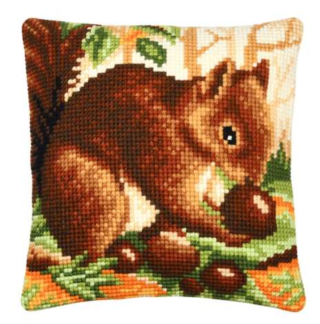 Kreuzstichkissen "Eichhörnchen mit Nüssen". Komplettpackung: Anleitung, Garn, Sticknadel. Ohne Kissenrücken und -füllung. Größe: 40 x 40 cm. Material: Stoff handbemalter Stramin 100 % Baumwolle (ca. 18 Stiche/10 cm), Garn 100 % Polyacryl.