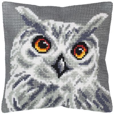 Kreuzstichkissen "Eule, grau". Superleicht zu sticken, geeignet für Kinder ab 8 Jahren. Komplettpackung: Anleitung, Garn, Sticknadel. Ohne Kissenrücken und -füllung. Größe: 40 x 40 cm. Material: Stoff bedruckter Stramin 100 % Baumwolle (ca. 18 Stiche/10 cm), Garn 100 % Polyacryl.