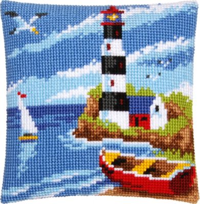 Kreuzstichkissen "Leuchtturm & Boote". Komplettpackung: Anleitung, Garn, Sticknadel. Ohne Kissenrücken und -füllung. Größe: 40 x 40 cm. Material: Stoff handbemalter Stramin 100 % Baumwolle (ca. 18 Stiche/10 cm), Garn 100 % Polyacryl.