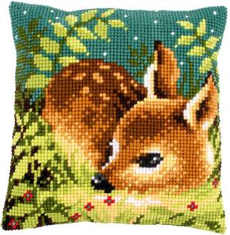 Kreuzstichkissen "Rehkitz". Superleicht zu sticken, geeignet für Kinder ab 8 Jahren. Komplettpackung: Anleitung, Garn, Sticknadel. Ohne Kissenrücken und -füllung. Größe: 40 x 40 cm. Material: Stoff handbemalter Stramin 100 % Baumwolle (ca. 18 Stiche/10 cm), Garn 100 % Polyacryl.