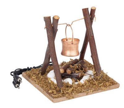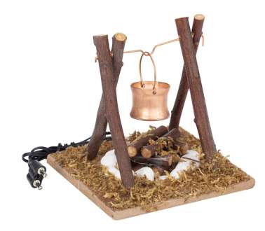 Ein Lagerfeuer gehört einfach zu jeder traditionellen und orientalischen Krippe dazu: Es diente den Hirten in früheren Zeiten als Kochgelegenheit sowie als Wärmequelle und half, wilde Tiere auf Distanz zu halten. Dieses Lagerfeuer-Modell ist aus Holz gefertigt und sehr detailreich verziert - mit Moos und einem Kessel aus Metall. Highlight aber ist das leuchtende "Feuer", das unter den Holzscheiten "brennt" und für eine heimelige Stimmung in Ihrer Krippe sorgt. Mit unserem Beleuchtungs-Trafo kann dieses sogar flackern.
