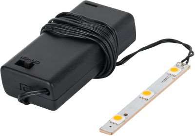 Batteriebetriebene LED-Beleuchtung, mit 3 LEDs, mit Batteriehalter, selbstklebend, Länge: 7 cm, Zuleitung: 98 cm. Ohne Batterien, Sie benötigen noch 2x AA Batterien.
