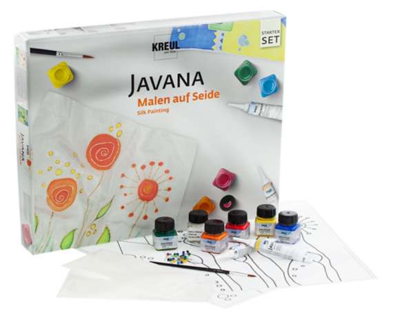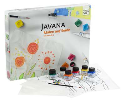 Malen auf Seide Starterset, Inhalt: 5 Gläser Seidenmalfarbe à 20 ml in Gelb, Orange, Rot, Blau und Dunkelgrün, 1 Tube Konturenfarbe 20 ml in Gold, 1 Glas Effektsalz, 1 Tube Konturenmittel Gutta 20 ml, 1 Pinsel, 2 Seidenzuschnitte 45 x 37 cm, 2 Motivvorlagen und Spannnadeln.