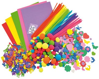 Mega-Bastelset, 550-teilig, Farbe: bunt, Inhalt: Moosgummi-Stanzteile Tiere, selbstklebend, Größe: 2–5 cm, Moosgummi-Stanzteile, Größe: 2–3,5 cm, Pompons, Größe: 1–3 cm Ø, Chenilledraht, Stärke: 5 mm, Länge: 30 cm, Moosgummiplatten, Größe: 21 x 29,7 cm (DIN A4) und Wackelaugen, Größe: 6–12 mm Ø.