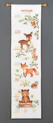 Messlatte "Tiere des Waldes", zum Besticken in Kreuz-, Spann- und Rückstich nach Zählvorlage (ca. 5,4 Stiche/cm). Komplettpackung: Anleitung, Zählvorlage, Alphabet, Zahlen, Garn, Sticknadel. Ohne Zierstange. Die Zählvorlage enthält alle Buchstaben des Alphabets und alle Zahlen, somit können Sie jeden Namen und jedes Datum beliebig sticken. Stofffarbe: weiß. Größe: 18 x 70 cm. Material: Aida-Stoff und Garn 100 % Baumwolle .